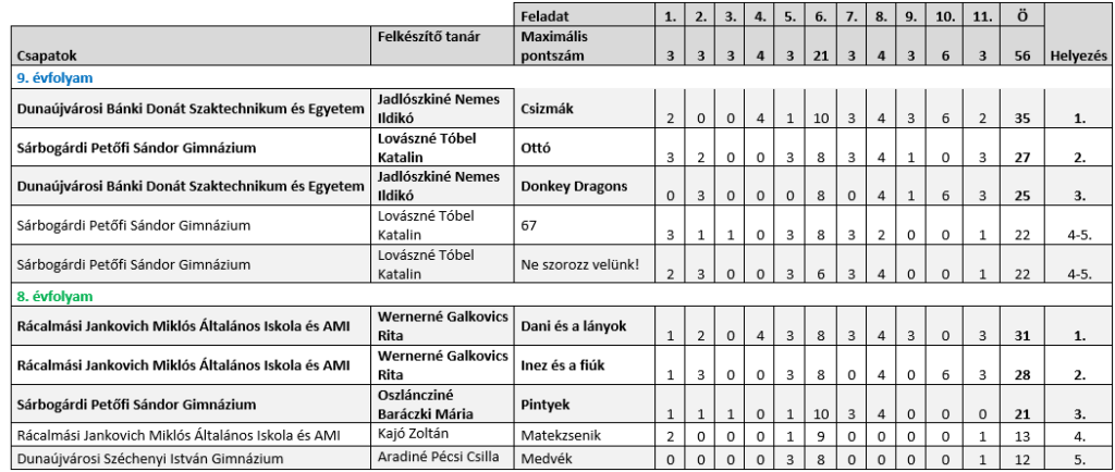 Az alábbi táblázatban foglaltuk össze az eredményeket. Gratulálunk a helyezést elért csapatoknak és felkészítő tanáraiknak. Valamennyi csapatnak köszönjük, hogy megtiszteltek bennünket a versenyen való részvételükkel.